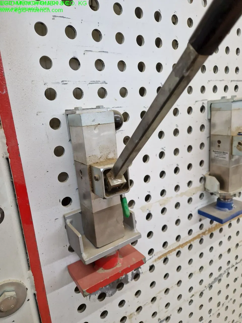 Die Presse verfügt über seitliche und untere Widerlager, die durchgehend und plan geschliffen sind, um auch bei hoher Beanspruchung präzise Ergebnisse zu gewährleisten. Der 15° geneigte Aufbau sorgt für sicheren Werkstückhalt während des Pressvorgangs.